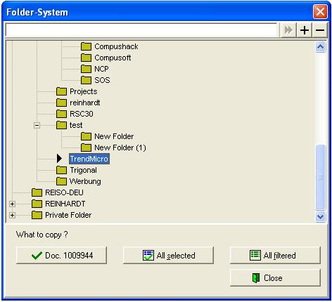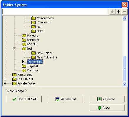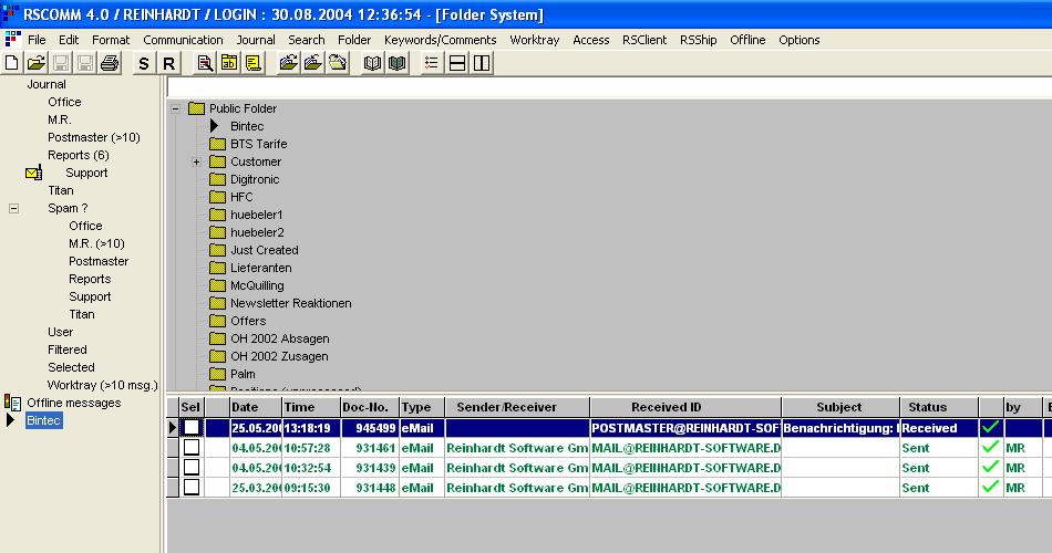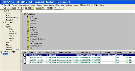 RSCOMM has a powerful filing system built iin. Public or private folders can be made in a logical 'tree' structure to suit your ways of doing business. Messages may be copied with 'drag and drop' or right mouse click directly from the journal or preview. Incidentally, messages are never removed from the main journal, so they remain available for everyone else to use. |